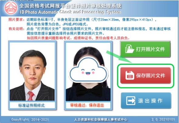 3.如果处理的照片符合要求,将自动调整裁切出标准报名照片;若不符合要求,会提示照片存在的问题。审核通过后点击“保存照片文件”,保存审核合格后的照片文件,默认文件名“报名照片.jpg”。