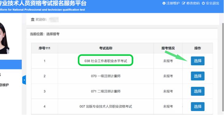 1.找到“038社会工作者职业水平考试”,点击“选择”,弹出“你已选择社会工作者职业水平考试”,点击“确定”。弹出信息确认后,点击“我已知晓”。