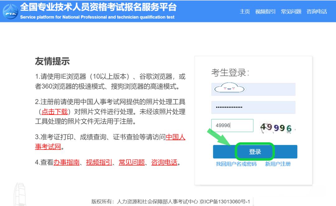 进入“中国人事考试网”,点击“网上报名”,进入考生登录页面,输入用户名、密码、验证码,点击“登录”。