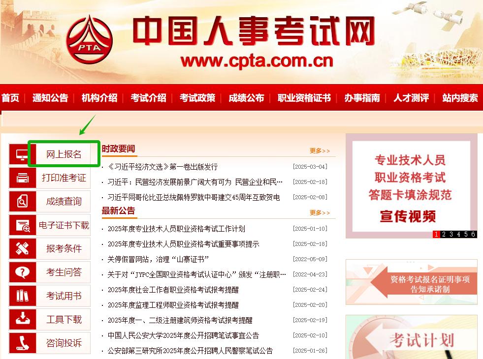 第一步:打开官方报名入口“中国人事考试网”(),点击“网上报名”。