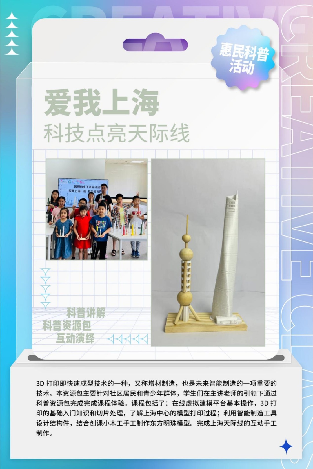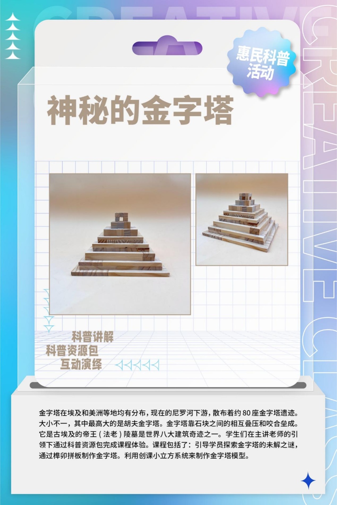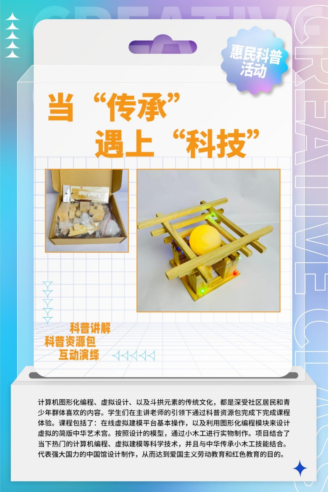 根据各社区书院日常开展动手类活动的需求,适合不同年龄段受众动手制作类或互动体验的活动资源包,每个资源包都配套一个视频或者远程教学课程。通过动手制作和科普体验活动,寓教于乐激发青少年好奇心和想象力、丰富社区居民的科普学习内容、增强市民对科学的兴趣和动手能力。
