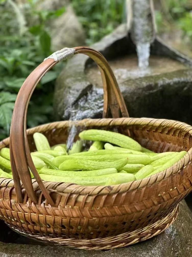 夏天的清晨,阿婶夫妇背着箩筐沿着山路走半个小时的路程,到达太子尖脚下的田地里,挑摘黄瓜。阿婶说黄瓜不能摘太老,需要顶花带刺半熟的那种,太熟的籽多肉厚不容易腌制。黄瓜摘到家,须在溪水里洗净,摘去瓜蒂与黄花,在阴凉处晾着,待黄瓜有些瘪软,方可下缸腌制。