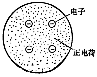 在二十世纪的前十年里,科学家们提出了几种原子模型,其中最有影响的是汤姆生提出的原子模型。在这个模型里,原子被认为是一个球体,正电荷均匀分布在整个球内,电子则象枣糕里的枣子那样镶嵌在球内(图 8–1),原子受到激发以后,电子开始振动发光,产生原子光谱。汤姆生的原子模型能够解释一些实验事实,但是没过几年就被卢瑟福发现的新的实验事实否定了。