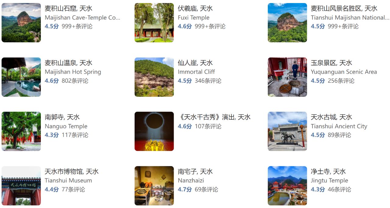 ② 市内:公交直达麦积山、伏羲庙,景区直通车覆盖石门山等远郊景点。