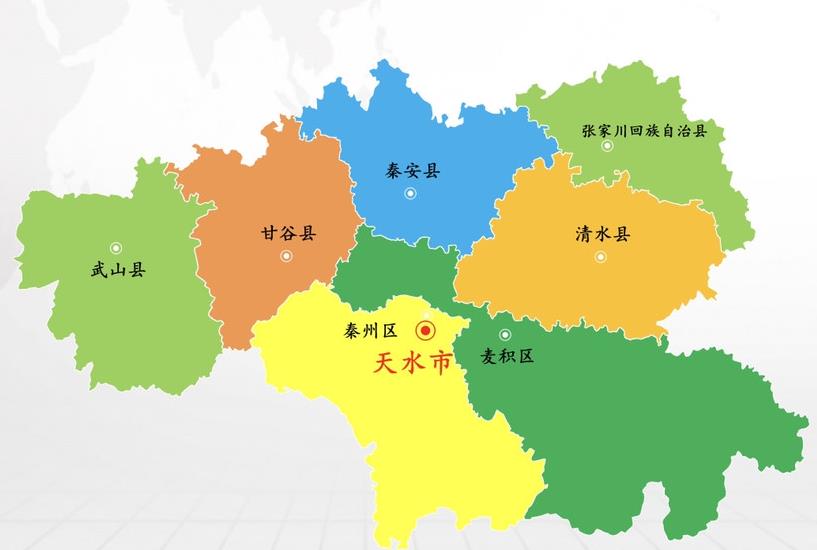 地理位置:天水位于甘肃省东南部,地处东经104°35′~106°44′、北纬34°05′~35°10′之间。天水市东与陕西省宝鸡市相接,西与定西市相接,北与平凉市相接,南与陇南市相接。天水市总面积为1.43万平方千米。