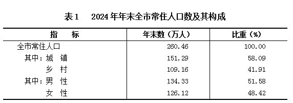 年末全市常住人口260.46万人,比上年末减少3.01万人。其中,城镇常住人口151.29万人,占常住人口比重为58.09%,比上年末提高1.56个百分点。全年全市出生人口1.47万人,出生率为5.60‰;死亡人口2.36万人,死亡率为9.02‰;自然增长率为-3.42‰。