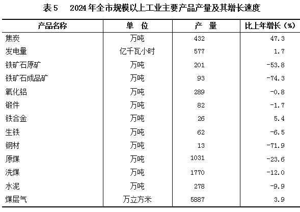 全年全市原煤产量10315.0万吨,比上年下降23.6%;焦炭产量431.6万吨,增长47.3%;发电量576.6亿千瓦时,增长1.7%。
