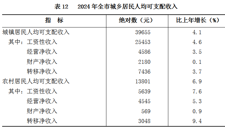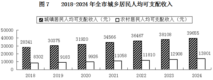 全年全市居民人均可支配收入25832元,比上年增长5.2%;居民人均消费支出15069元,增长4.2%。按常住地分,城镇居民人均可支配收入39655元,增长4.1%,城镇居民人均消费支出19720元,增长3.0%;农村居民人均可支配收入13801元,增长6.9%,农村居民人均消费支出11022元,增长5.6%。全市城乡居民人均可支配收入比值为2.87,比上年缩小0.08。