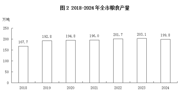 全年全市粮食产量199.8万吨,比上年减少3.4万吨,下降1.6%。其中,夏粮0.2万吨,增长14.7%;秋粮199.6万吨,下降1.7%。