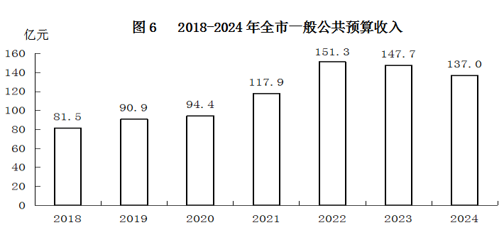 全年全市一般公共预算收入完成137.0亿元,比上年下降7.2%;其中,税收收入完成91.9亿元,下降17.0%。税收收入中,国内增值税、企业所得税、个人所得税、资源税和城市维护建设税共计完成税收75.1亿元,下降18.6%。