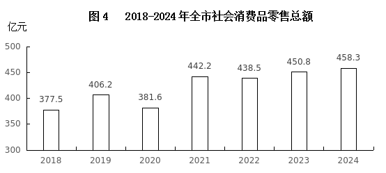 全年全市社会消费品零售总额458.3亿元,比上年增长1.7%。按经营地统计,城镇消费品零售额313.5亿元,增长2.1%;乡村消费品零售额144.8亿元,增长0.8%。按消费类型统计,商品零售额425.9亿元,增长1.7%;餐饮收入32.5亿元,增长0.9%。