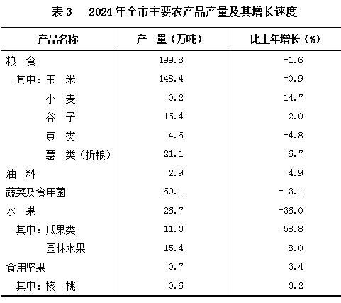 全年全市农作物种植面积477.9千公顷,比上年减少2.4千公顷。其中,粮食种植面积431.2千公顷,增加0.7千公顷;油料种植面积16.9千公顷,增加0.4千公顷;中草药材种植面积3.7千公顷,增加0.3千公顷;蔬菜种植面积19.0千公顷,减少1.7千公顷。在粮食种植面积中,玉米种植面积232.4千公顷,减少0.6千公顷;小麦种植面积0.3千公顷,增加0.1千公顷。果园面积13.8千公顷,减少0.6千公顷。