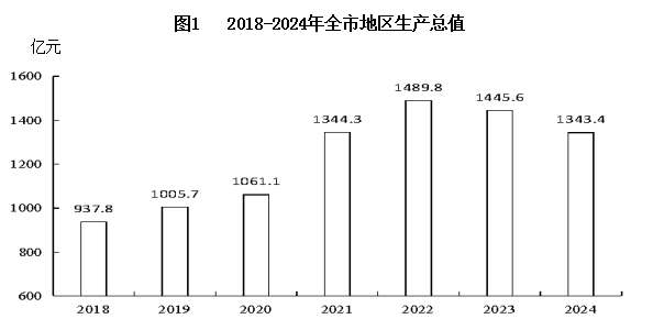 初步核算,全年全市实现地区生产总值1343.4亿元,按不变价格计算,比上年下降2.2%。其中,第一产业增加值127.6亿元,增长1.3%,占地区生产总值的比重9.5%;第二产业增加值545.9亿元,下降6.7%,占地区生产总值的比重40.6%;第三产业增加值669.9亿元,增长0.4%,占地区生产总值的比重49.9%。人均地区生产总值51281元,比上年下降1.3%,按2024年平均汇率计算为7201美元。