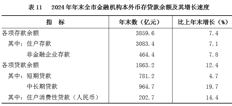 年末全市金融机构本外币各项存款余额3859.6亿元,比上年末增长7.4%,比年初增加265.8亿元。各项贷款余额1863.2亿元,比上年末增长12.4%,比年初增加205.3亿元。