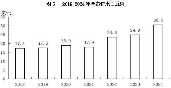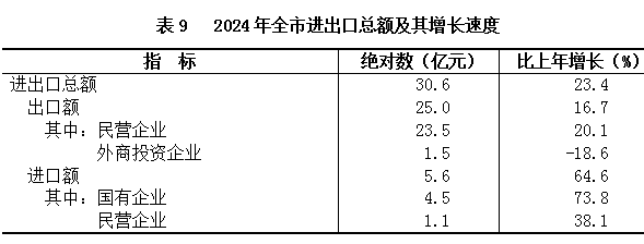 全年全市进出口总额30.6亿元,比上年增长23.4%。其中,进口额5.6亿元,增长64.6%;出口额25.0亿元,增长16.7%。