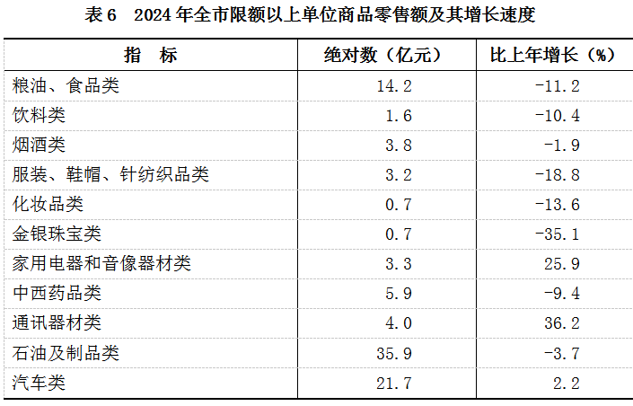 全年全市限额以上单位消费品零售额116.0亿元,下降1.5%。