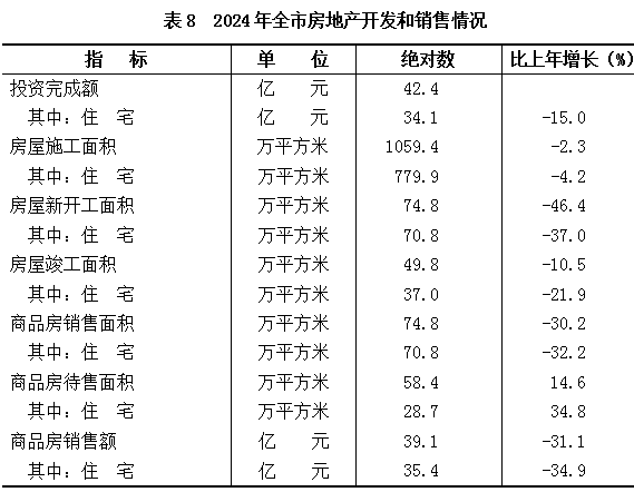 全年全市房地产开发投资42.4亿元,比上年下降15.0%。其中,住宅投资34.1亿元,下降15.0%。