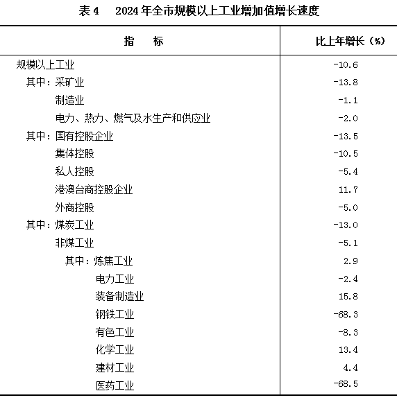 全年全市全部工业增加值511.3亿元,按不变价格计算,比上年下降6.9%。规模以上工业增加值下降10.6%。分门类看,采矿业下降13.8%,制造业下降1.1%,电力、热力、燃气及水生产和供应业下降2.0%;分煤与非煤看,煤炭工业下降13.0%,非煤工业下降5.1%。