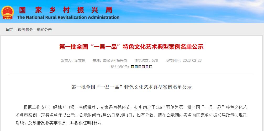 根据工作安排,经地方申报、省级推荐、专家评审等环节,初步确定了146个案例为第一批全国“一县一品”特色文化艺术典型案例。现将名单予以公示,公示时间为2月23日至3月1日。如有异议,请在公示期内实名向国家乡村振兴局政策法规司反映。反映情况要实事求是,并提供证明材料。