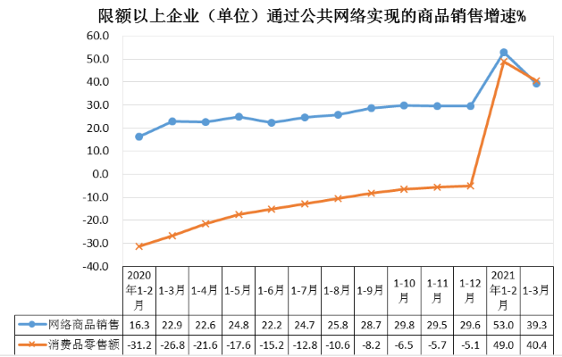 疫情防控常态化的情况下,消费者消费习惯向线上进一步扩展,同时商贸企业加快数字化转型步伐,网上零售额增速保持高位运行。一季度,全省限额以上单位通过公共网络实现商品销售195.0亿元,同比增长39.3%,较2020年全年提高9.7个百分点。限上单位通过公共网络实现商品销售占限上消费品零售额的比重为17.0%,占比较上年同期提升0.3个百分点。