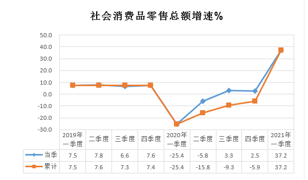 2021年一季度,随着疫情防控形势持续稳固,省委省政府“稳增长、促消费”政策的不断推进,市场预期持续改善,消费需求不断增加,同时受去年同期基数较低因素影响,全省消费品市场增长较快,实现良好开局。