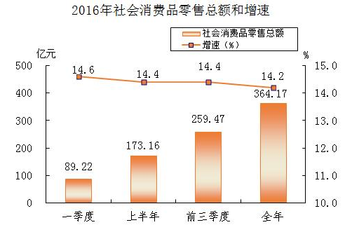 实现社会消费品零售总额364.17亿元,比上年增长14.2%。按经营单位所在地分,城镇消费品零售额297.28亿元,增长13.9%;乡村消费品零售额66.89亿元,增长15.3%;按消费形态分,商品零售额320.97亿元,增长13.8%,餐饮收入43.20亿元,增长16.5%。