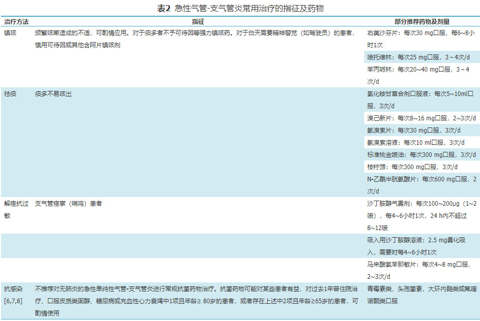急性气管-支气管炎治疗策略在于最大程度地减轻症状。对于许多轻微咳嗽患者,日常活动及睡眠不受影响时,可选择观察。对于显著的喘鸣、活动后或夜间咳嗽明显,影响学习、生活、工作和睡眠,甚至可能引起气胸、肋骨骨折、晕厥等并发症的患者可予相关对症治疗[1,6]。常用治疗药物及指征见表2。