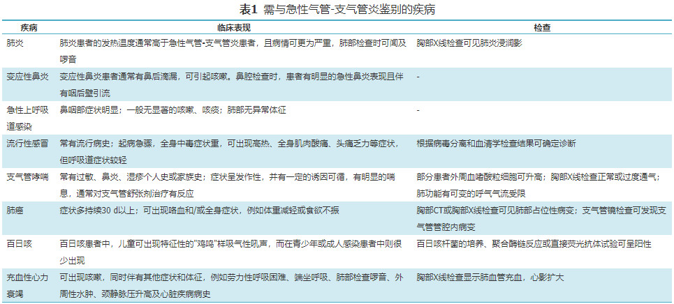 需与急性气管-支气管炎鉴别的疾病见表1。