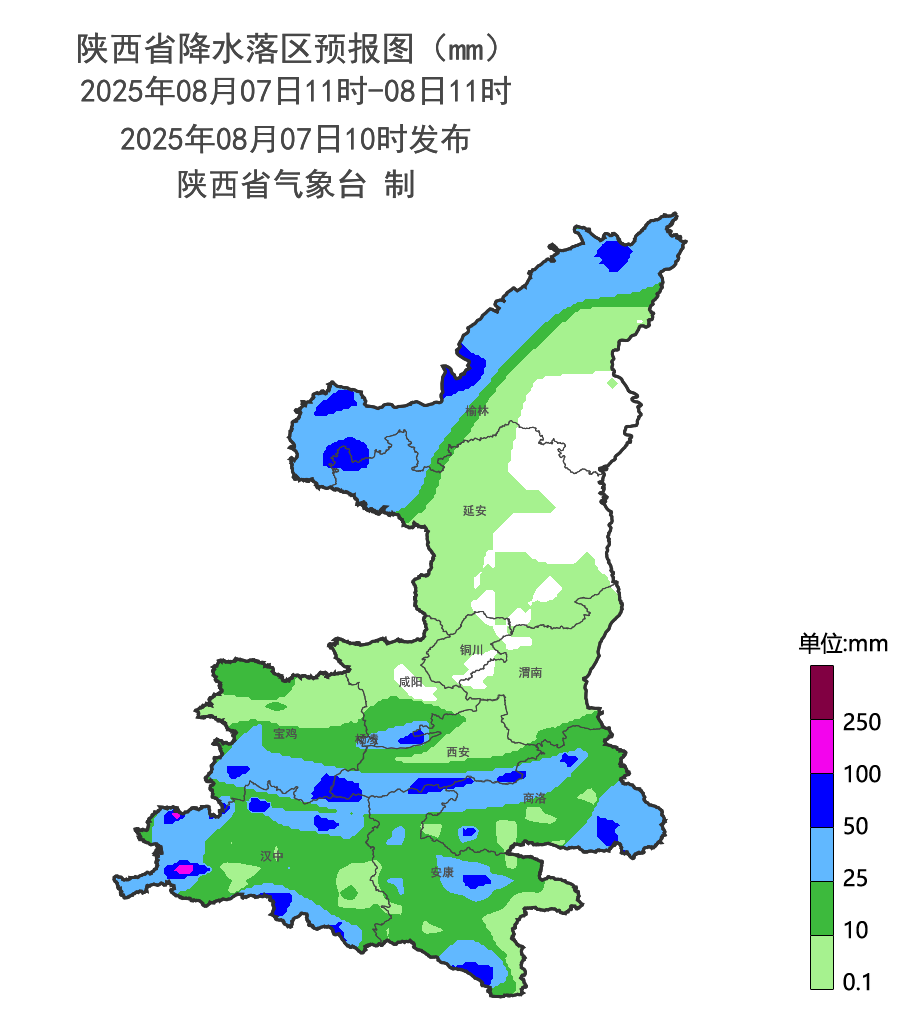 受副热带高压和低层切变共同影响,预计8月7日11时至8月8日11时,西安西部及南部山区、宝鸡西南部山区、咸阳南部、延安西部、榆林西部、汉中部分、安康部分、商洛部分地方、杨凌示范区有大雨(25~50毫米);西安南部局地(长安区、鄠邑区、蓝田县、周至县),宝鸡南部局地(太白县、凤县),咸阳南部局地(秦都区、兴平市)、延安西部(吴起县)、榆林西部(榆阳区、横山区、神木市、府谷县、定边县、靖边县),汉中局地(南郑区、城固县、洋县、勉县、略阳县、镇巴县、宁强县、留坝县、佛坪县),安康局地(汉滨区、宁陕县、岚皋县、平利县、镇坪县、旬阳市),商洛局地(商州区、洛南县、山阳县、镇安县、丹凤县、商南县)有暴雨(50~100毫米),其中汉中略阳县、宁强县有大暴雨(100~180毫米)。上述部分地区伴有短时强降水(最大小时降雨量30~50毫米,局地可达80毫米以上),局地有雷暴大风或冰雹等强对流天气。
