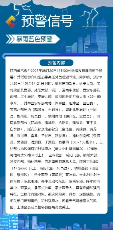 陕西省气象台8月20日13时00分继续发布暴雨蓝色预警。