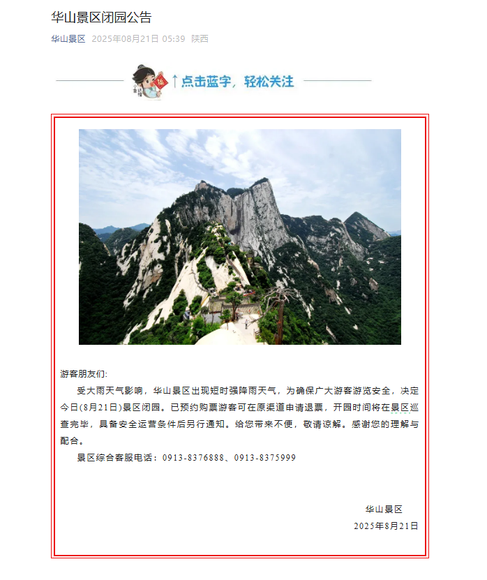 8月21日,华山景区官方账号发布闭园公告。受大雨天气影响,华山景区出现短时强降雨天气,为确保广大游客游览安全,决定今日(8月21日)景区闭园。已预约购票游客可在原渠道申请退票,开园时间将在景区巡查完毕,具备安全运营条件后另行通知。