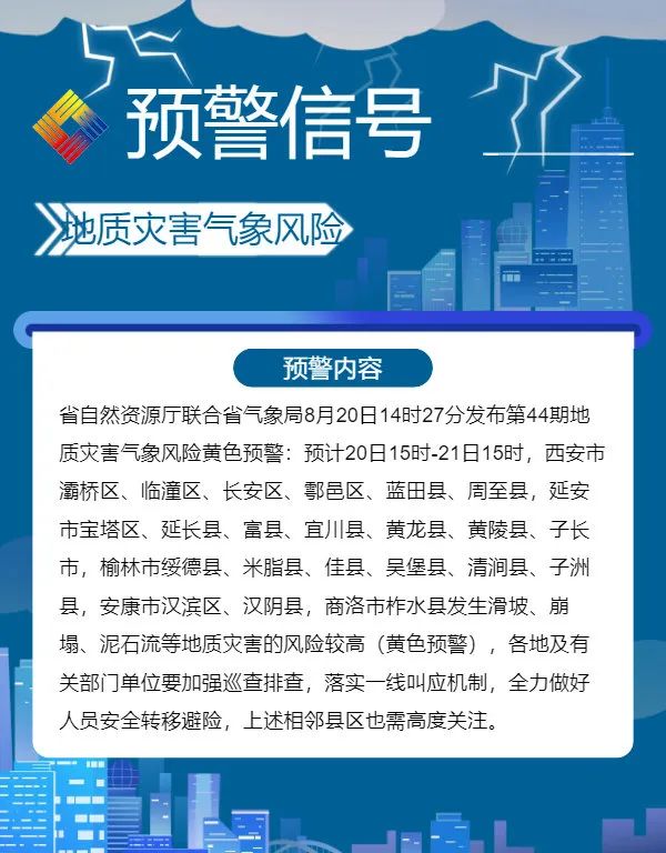 省自然资源厅联合省气象局8月20日14时27分发布地质灾害黄色预警。