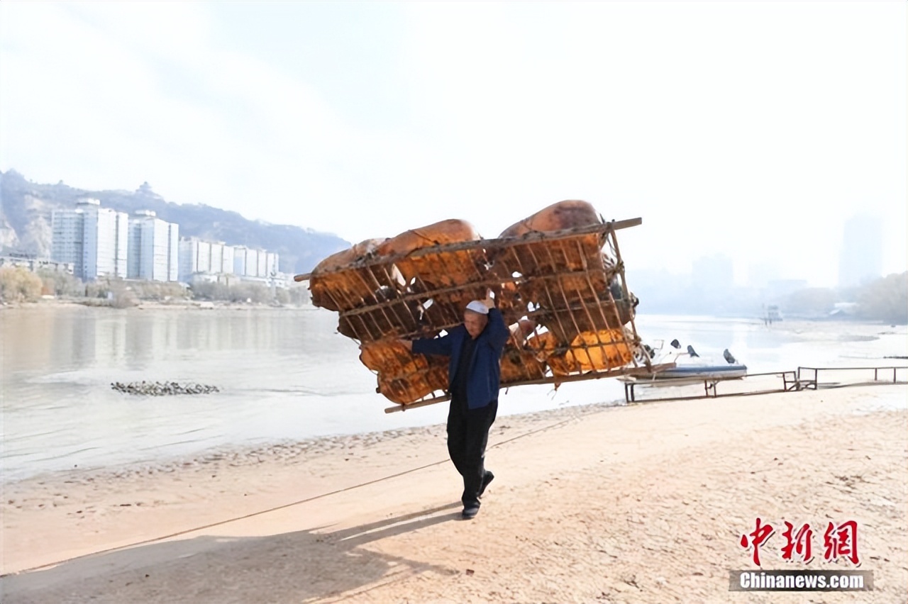 黄河边,“筏子客”扛起制作好的羊皮筏子准备下水。中新社记者 杨艳敏 摄