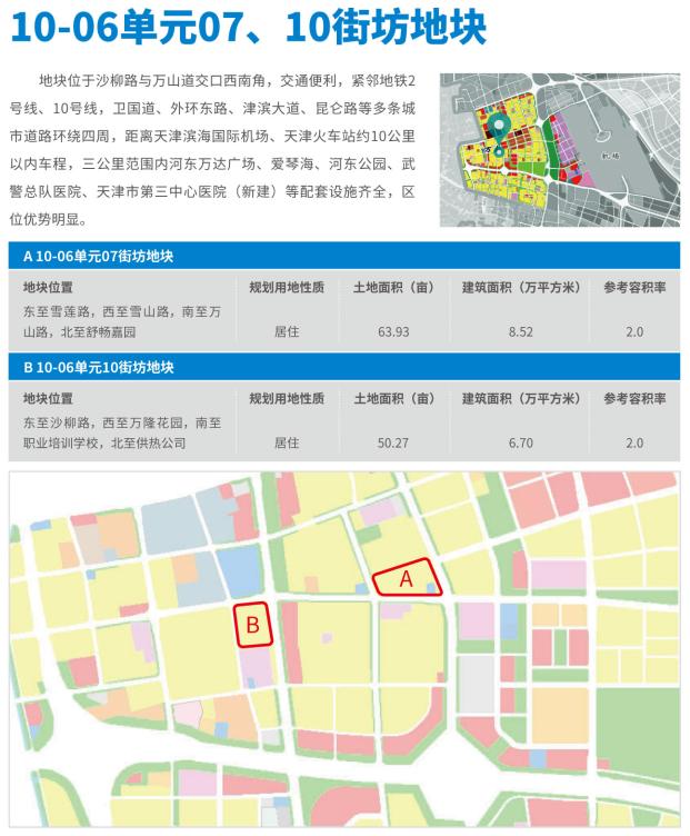 万新区域地处天津市中心城区,东南半环快速路、津滨大道、卫国道等交通干道贯穿辖区,地铁2号线、4号线、10号线等轨道交通交织成网,毗邻天津滨海国际机场。依托天津“设计之都”核心区和“新程林”地区开发建设,公共服务设施齐全、城市开放空间宜人。该区域重点推介观璎戏校地块、机场路地块、国山路地块、万山道北侧地块,07街坊、10街坊地块共计六宗地块,可用地面积427亩。