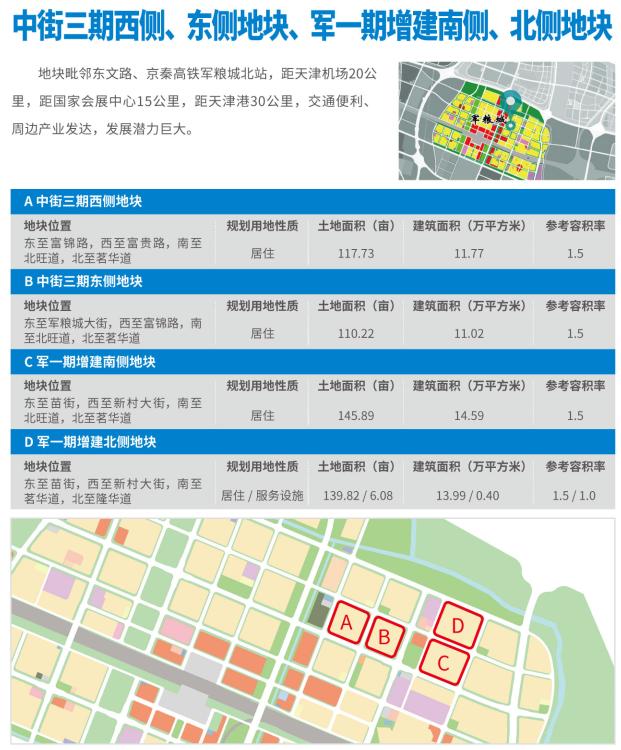 该区域重点推介中街三期东侧、西侧地块,军一期增建南侧、北侧地块共计四宗地块,可用地面积520亩。