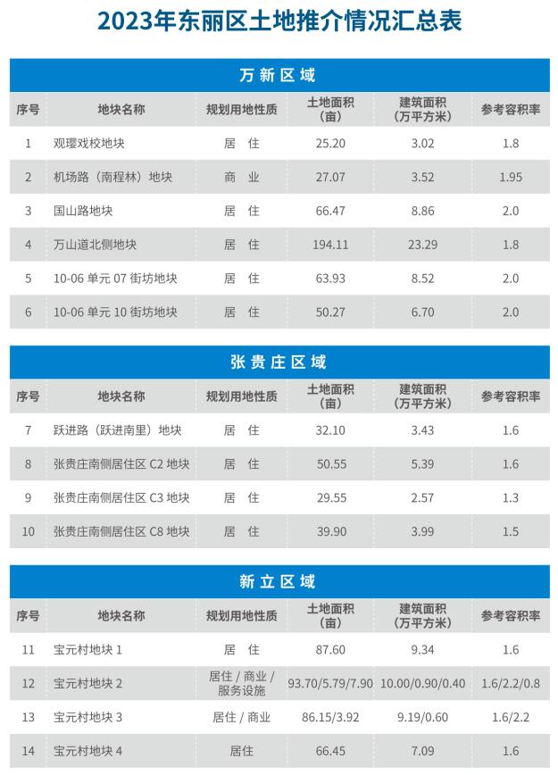 为更好推进产城融合,加快重点区域开发建设和城市更新,2023年东丽区将重点推介29宗居住和商服用地,可用地面积共计2526亩,涵盖区内万新、张贵庄、新立、金钟、军粮城、东丽湖六大区域。
