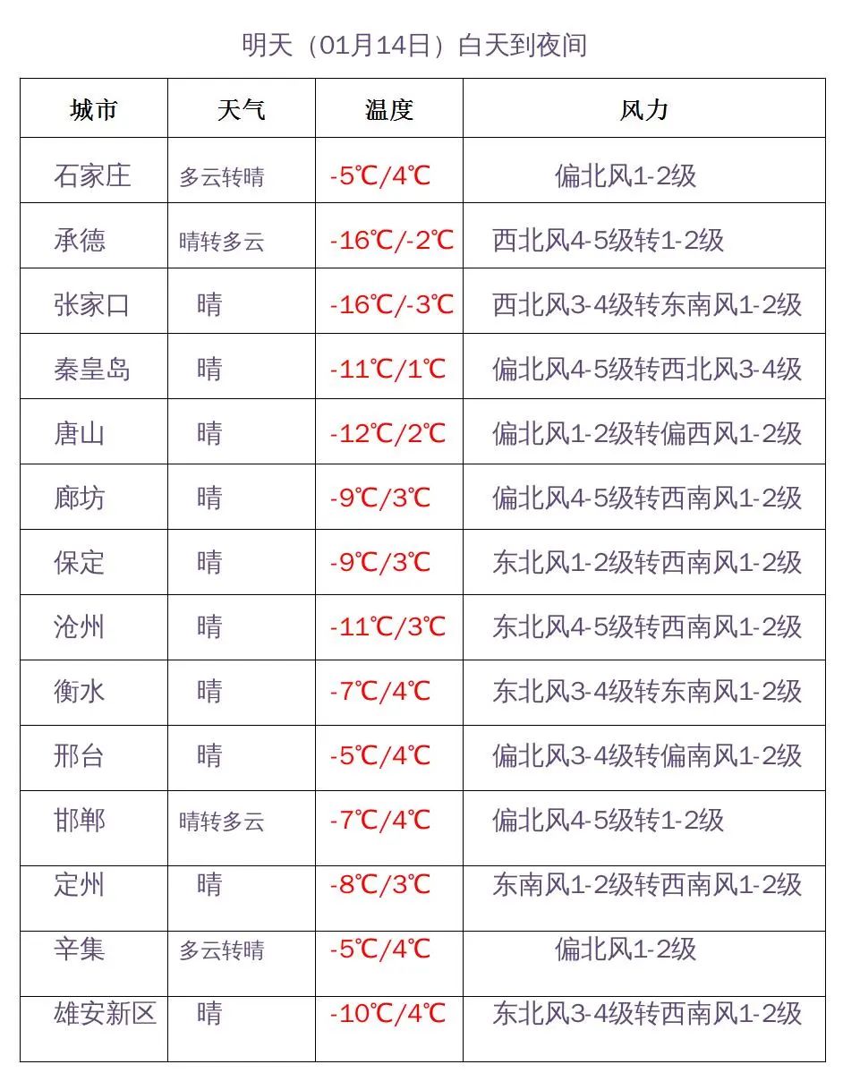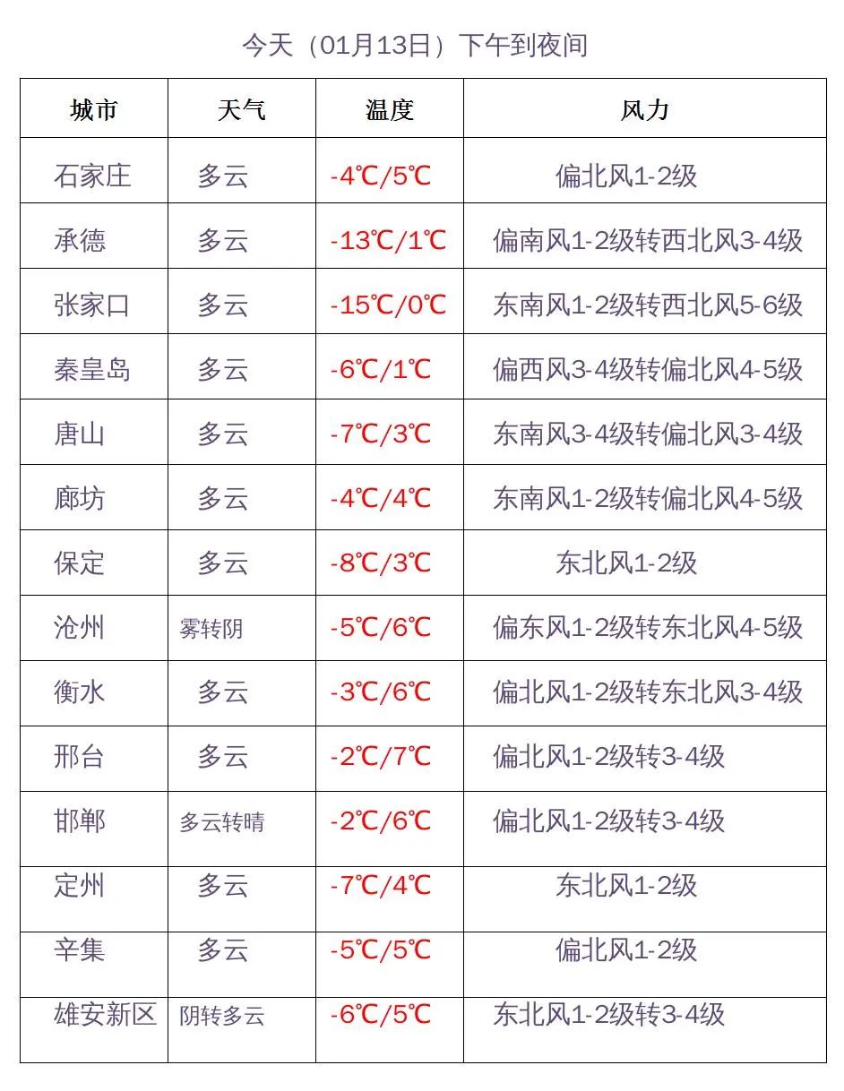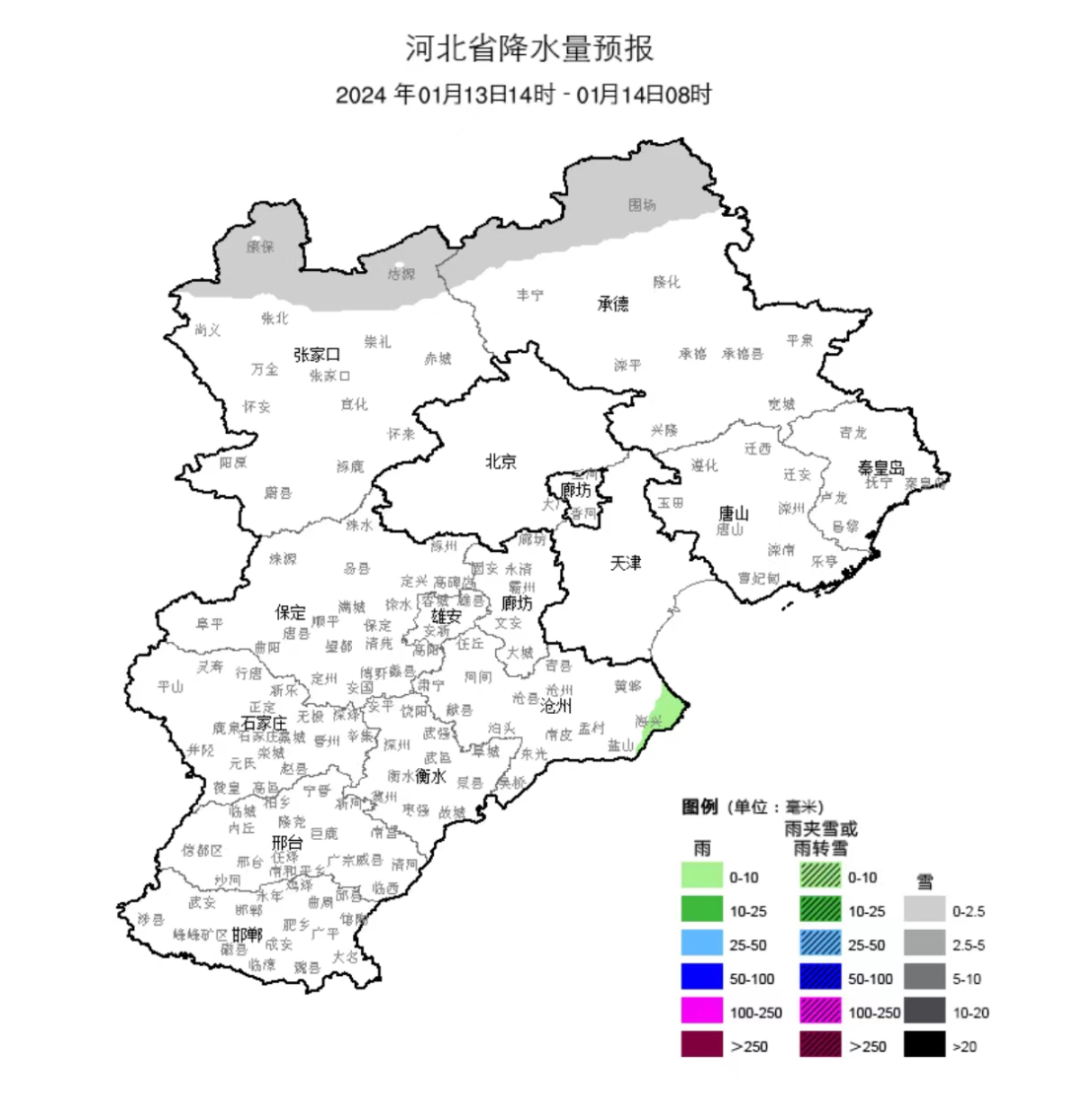 河北省气象台2024年01月13日11时发布天气预报: