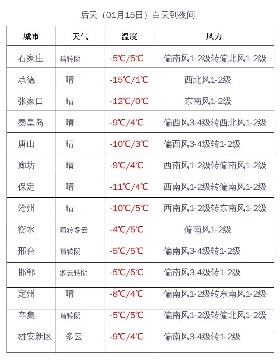 明天到15日早晨,北部地区最低气温下降6~8℃,其中坝上地区下降8~10℃;其他地区下降4~6℃。