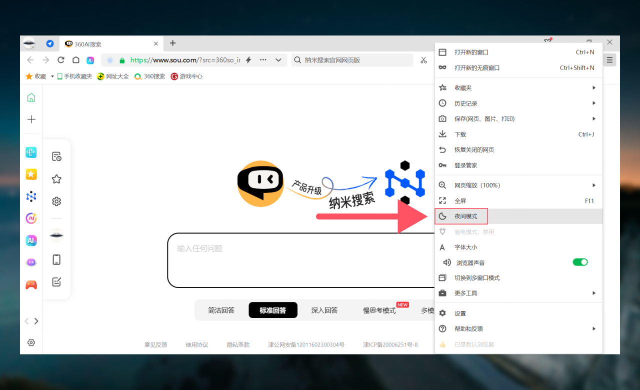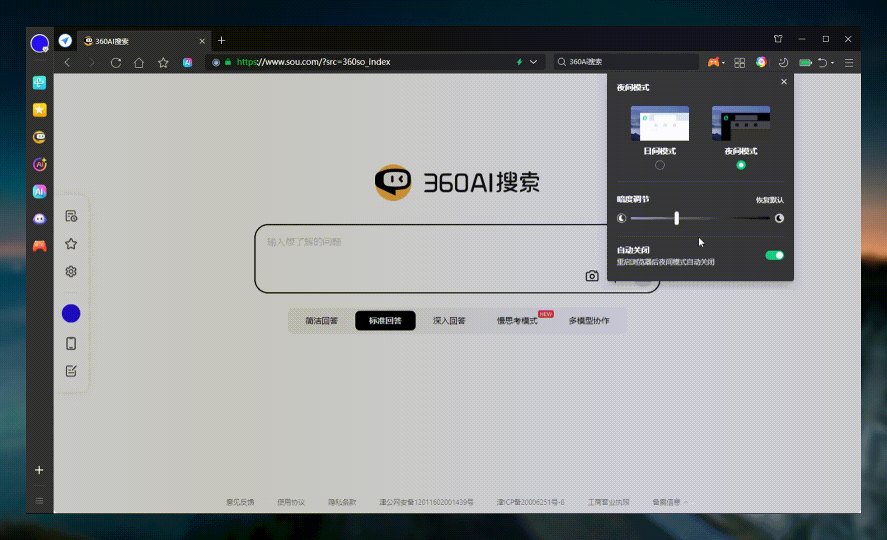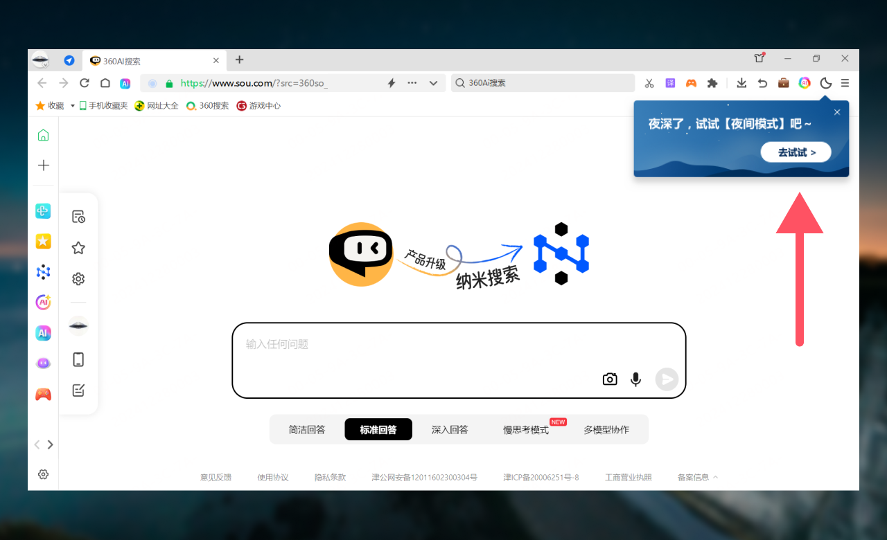 ➢ 当浏览器识别到你在晚上21:00-凌晨5:00之间还在使用浏览器,会自动出现弹窗,提示你「夜深了,试试夜间模式吧~」,点击即可打开设置面板。