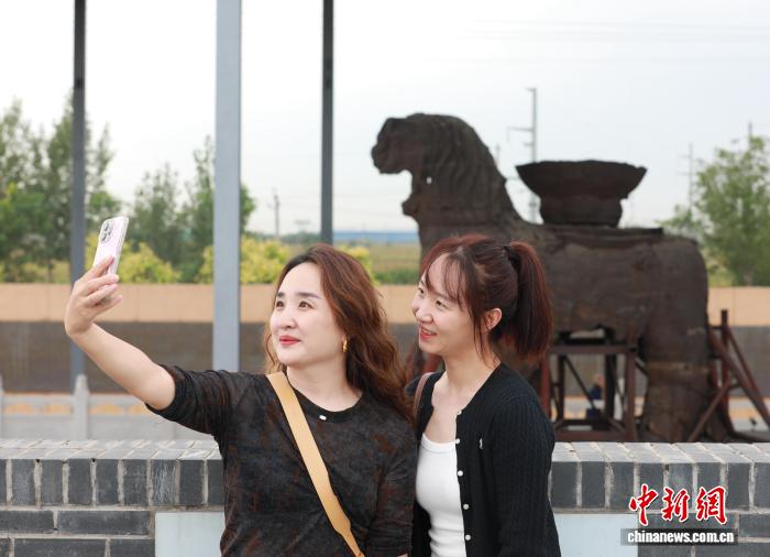 10月2日,在河北省沧州铁狮与旧城遗址公园,游客打卡留念。田博 摄
