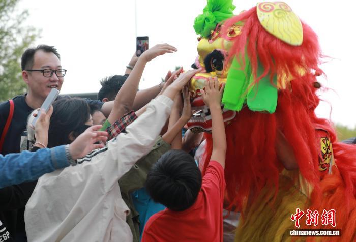 10月2日,在河北省沧州铁狮与旧城遗址公园,舞狮演员与游客互动。田博 摄