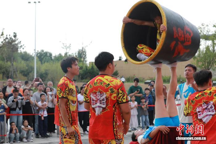10月2日,杂技演员在河北省沧州铁狮与旧城遗址公园表演杂技。田博 摄