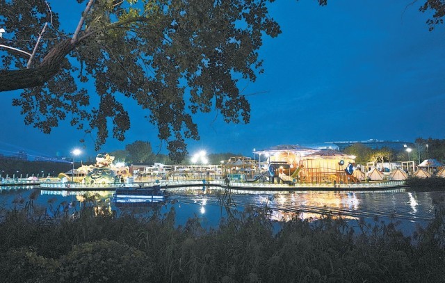 朝阳公园中心岛,孩子们在灯光彩饰的沙滩上玩耍。