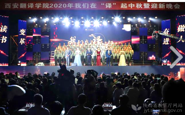 【西安翻译学院】9月29日晚,该院举办了我们在“译”起——2020年中秋暨迎新晚会。学院全体院领导出席本次晚会,与全院3万余名师生感受终南文化,共庆中庆佳节。学院董事长丁晶深情寄语师生,她希望大家不忘初心、乘风破浪,不断提高自身综合素质,谱写属于自己的奋斗画卷,抒写美丽西译的精彩华章,为实现中华民族伟大复兴贡献力量。晚会期间,执行董事崔智林、院长韩江水、党委书记李虎成为大家现场分发月饼,共叙团圆。军训三营演唱的《我和我的祖国》《走向复兴》中拉开帷幕,他们身着统一的制服,用激情澎湃的歌声,展现出西译学子昂扬向上的风采和朝气蓬勃的面貌;歌舞《Dynamite》,举手投足间无不传递出大学生的蓬勃朝气与欢快热闹的节日氛围;舞蹈《2020 春》,一个关于白衣天使无畏守护的故事温情上映,舞者一颦一笑间饱含真挚情感,身形变换中带领在场观众重温抗“疫”之路,在节日欢乐之余收获满满感动。台上节目精彩纷呈,场下掌声欢笑不断。此次晚会由院团委全新编排,围绕抗击疫情、实现中华民族伟大复兴的第一个百年目标等内容展开,以“中秋月西译情”为主题,内容以情感人,节目形式多样,内容积极向上,富有时代感。以歌颂祖国、褒扬全院在33年教育教学中涌现出来的先进人物和典型事迹为基调,展现了全校西译师生昂扬向上的精神面貌,进一步凝聚正能量、提振精气神。晚会洋溢着一派欢乐、祥和的气象,为广大师生奉献了一场精彩的终南中秋文化盛宴。