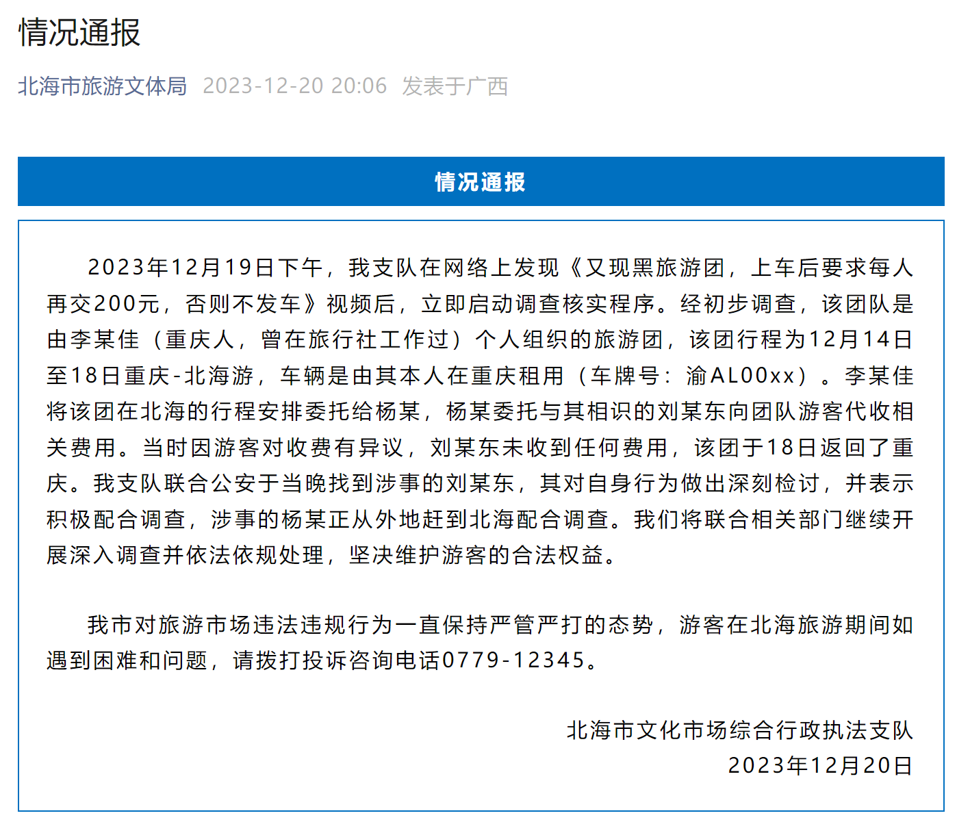 通报中介绍,2023年12月19日下午,该支队在网络上发现《又现黑旅游团,上车后要求每人再交200元,否则不发车》视频后,立即启动调查核实程序。经初步调查,该团队是由李某佳(重庆人,曾在旅行社工作过)个人组织的旅游团,该团行程为12月14日至18日重庆-北海游,车辆是由其本人在重庆租用(车牌号:渝AL00xx)。李某佳将该团在北海的行程安排委托给杨某,杨某委托与其相识的刘某东向团队游客代收相关费用。当时因游客对收费有异议,刘某东未收到任何费用,该团于18日返回了重庆。该支队联合公安于当晚找到涉事的刘某东,其对自身行为做出深刻检讨,并表示积极配合调查,涉事的杨某正从外地赶到北海配合调查。该支队将联合相关部门继续开展深入调查并依法依规处理,坚决维护游客的合法权益。