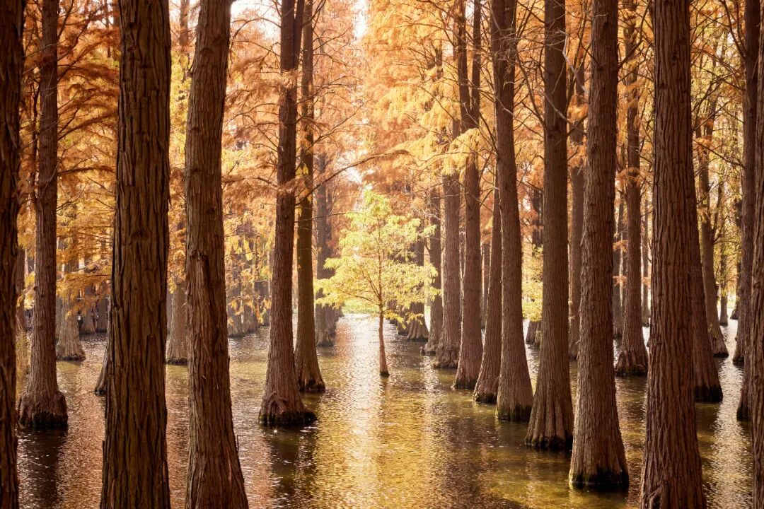 青山湖水上森林,被称为“抹茶森林”,夏天是杭州的绿野仙踪,秋天也是青山湖的最美时节。这里的水清澈见底,湖面与四周的秋色相得益彰,秋叶飘零,仿佛进入了一个天然的水墨画世界。行走在蜿蜒曲折的木栈道上,四周都是红黄相间的水杉林,穿梭在秋色斑斓的林间,感受温柔又纯粹的秋韵。
