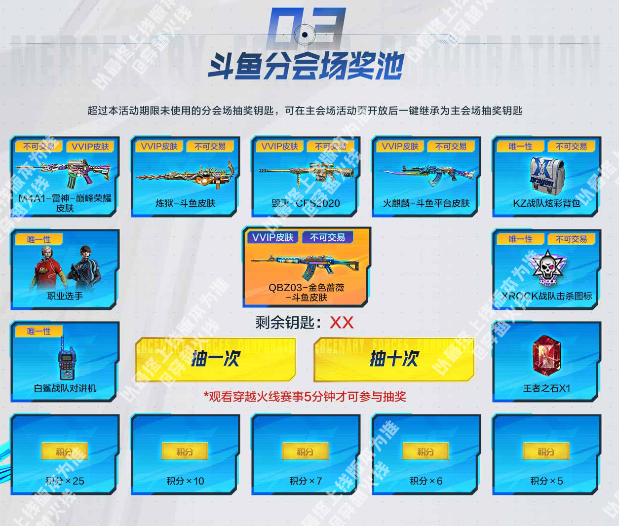 斗鱼分会场奖池,除了M4A1-雷神-巅峰荣耀皮肤、毁灭CFS2020皮肤和职业选手角色外,还额外加入了QBZ03-金色蔷薇-斗鱼皮肤、炼狱-斗鱼皮肤、火麒麟-斗鱼平台皮肤、KZ战队炫彩背包、白鲨战队对讲机、XROCK战队击杀图标等道具。