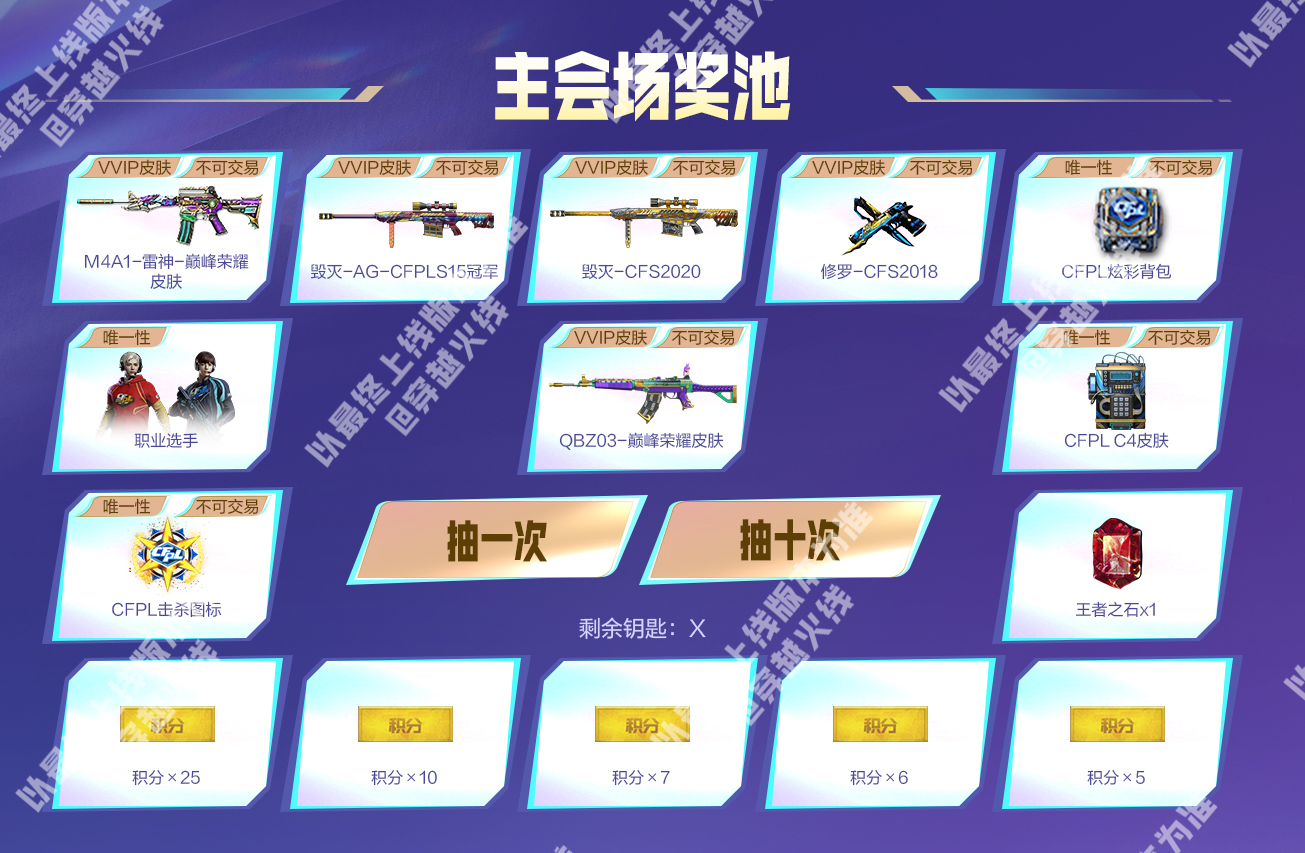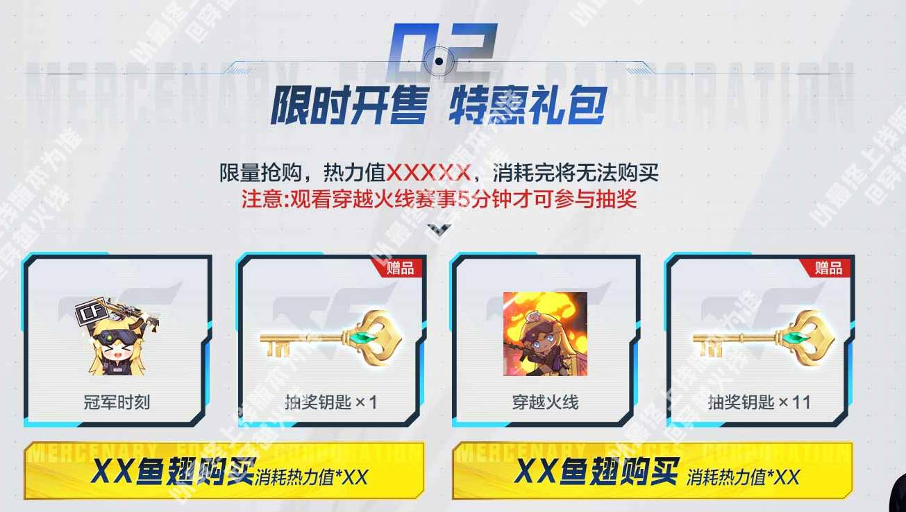 活动期间将限时发售特惠礼包,CFer们在活动页面购买冠军时刻和穿越火线将获赠指定数额的抽奖钥匙,抽奖钥匙可用于下方斗鱼分会场主奖池的抽奖。