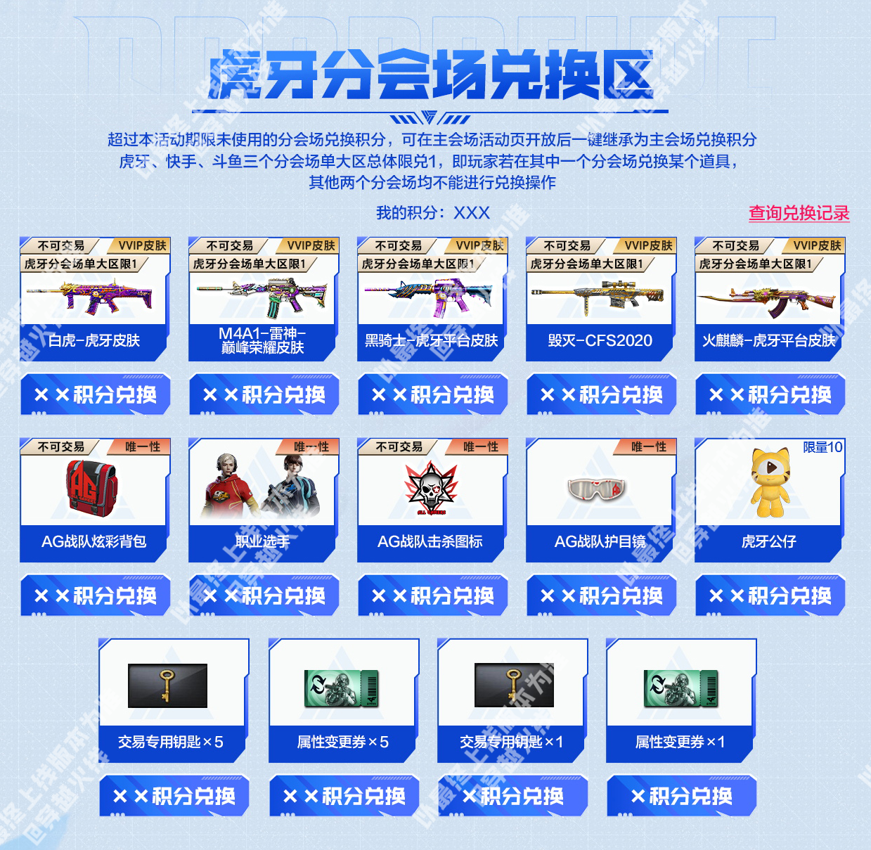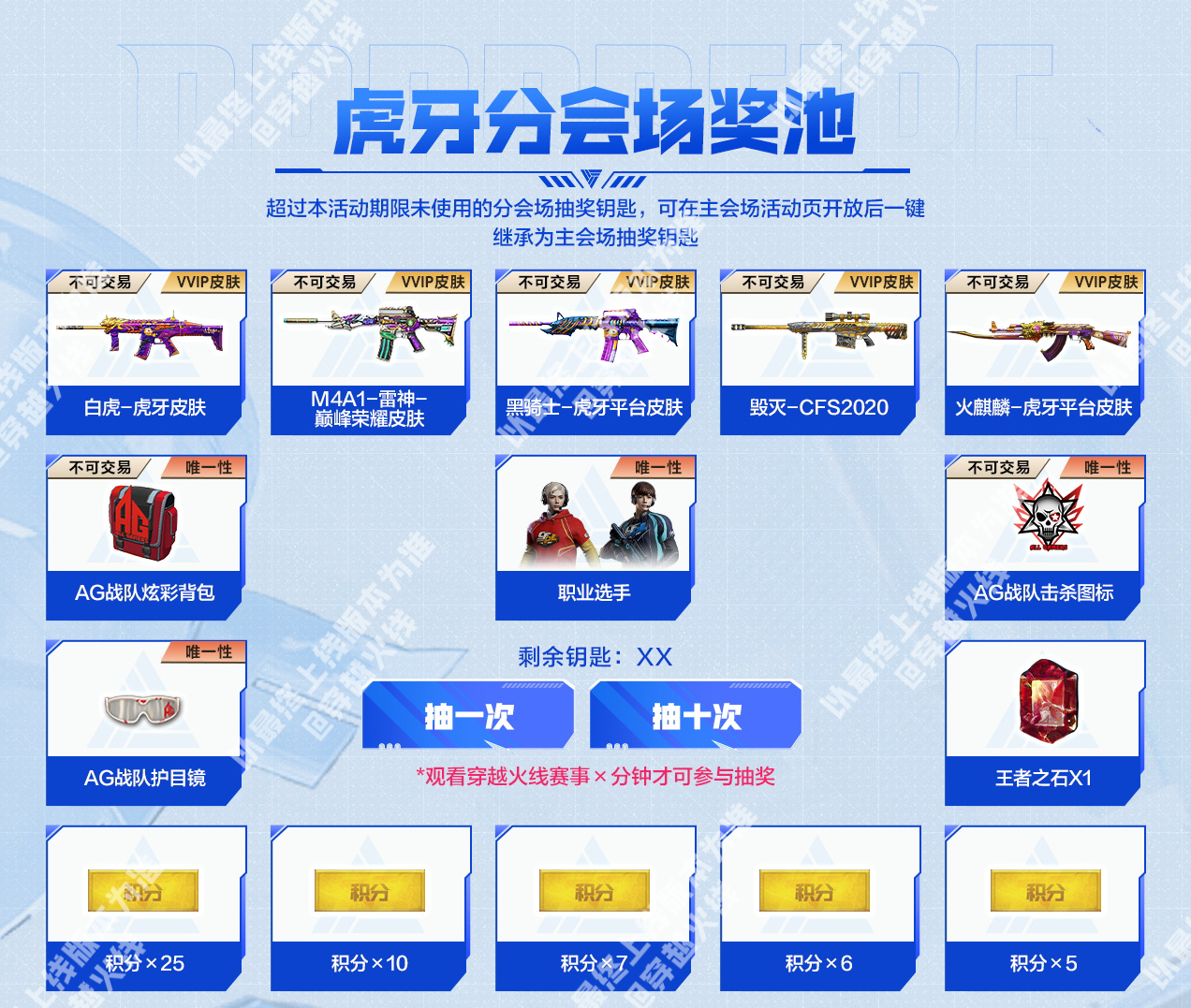 虎牙分会场奖池,除了M4A1-雷神-巅峰荣耀皮肤、毁灭CFS2020皮肤职业选手角色外,还额外加入了白虎-虎牙皮肤、黑骑士-虎牙平台皮肤、火麒麟-虎牙平台皮肤、AG战队炫彩背包、AG战队护目镜、AG战队击杀图标等道具。
