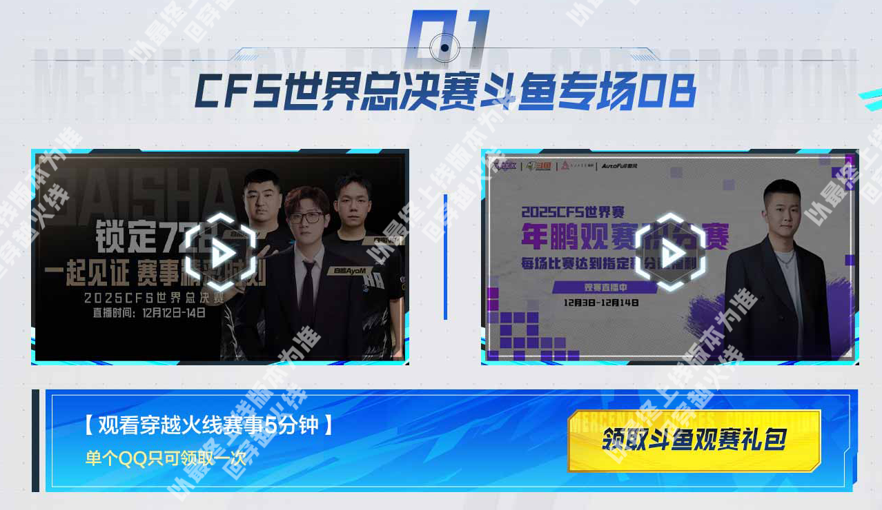CFer在斗鱼平台观看穿越火线赛事达到对应时间,即可领取斗鱼观赛礼包。